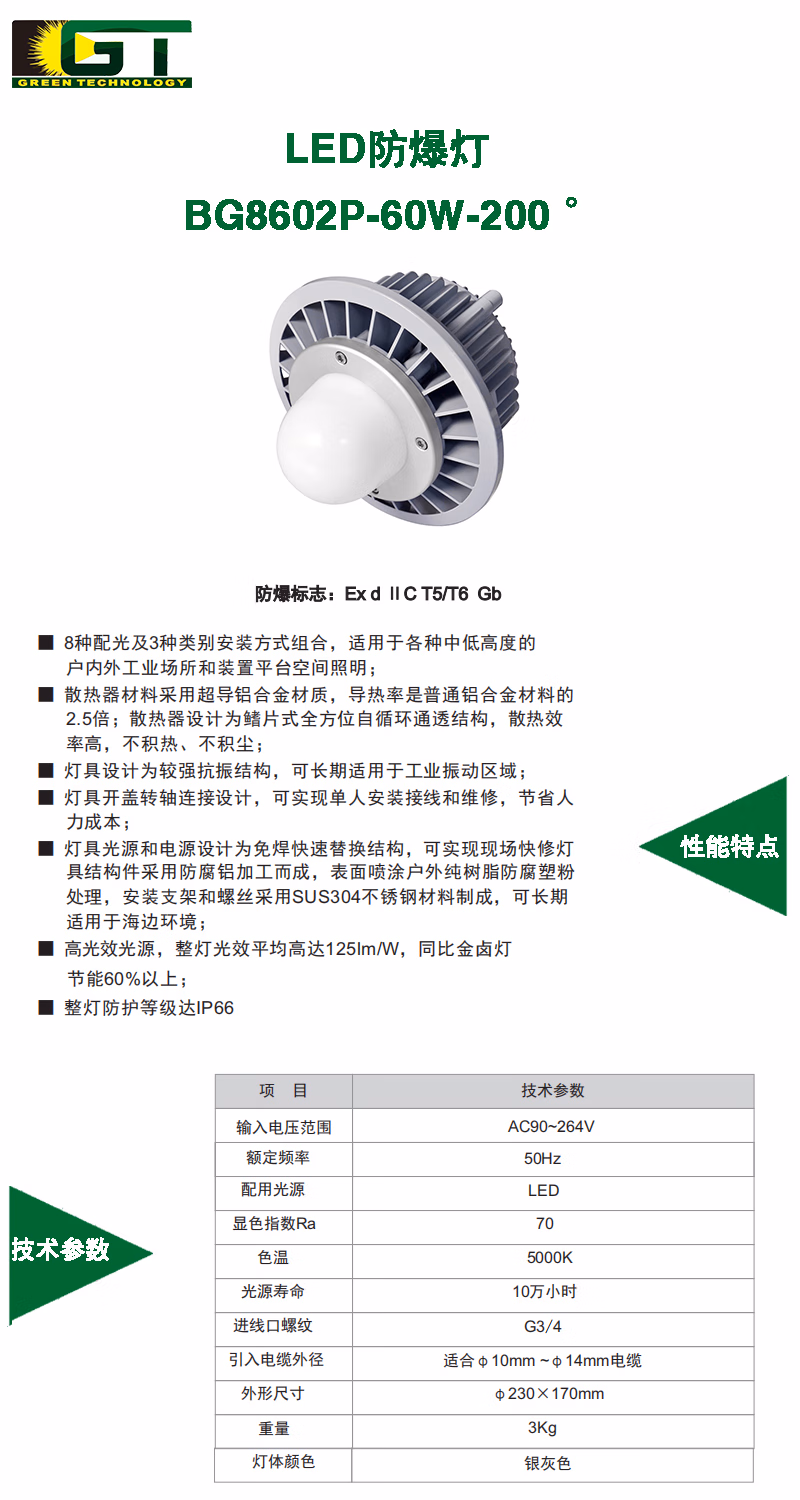 吉特(GT) BG8602P-60W-200° 60W IP66 Ex d ⅡC T5/T6 Gb AC90~264V 色温5000K LED防爆灯 (计价单位:盏) 银灰色