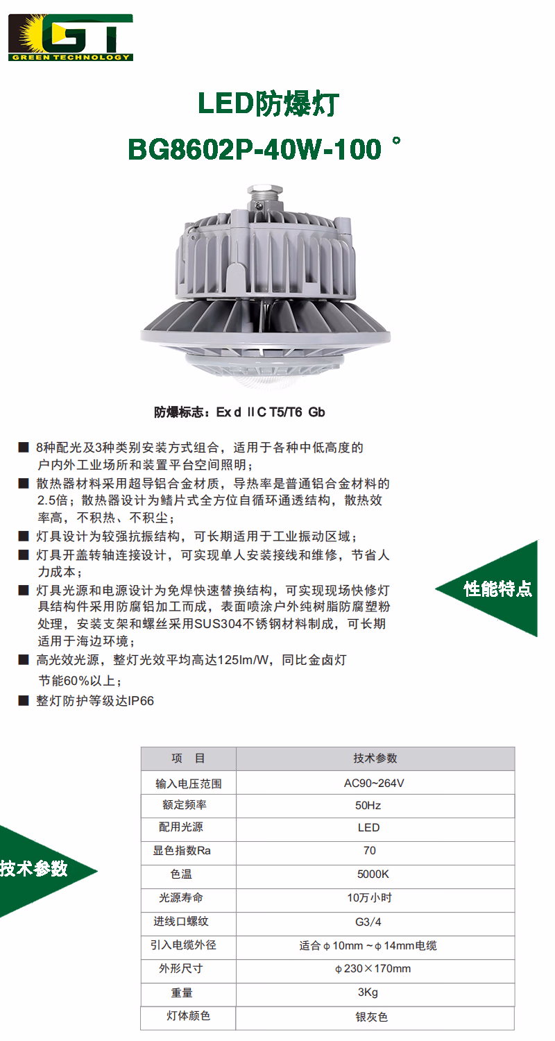 吉特(GT) BG8602P-40W-100° 40W IP66 Ex d ⅡC T5/T6 Gb 电压AC90~264V 色温5000K LED防爆灯 (计价单位:盏) 银灰色