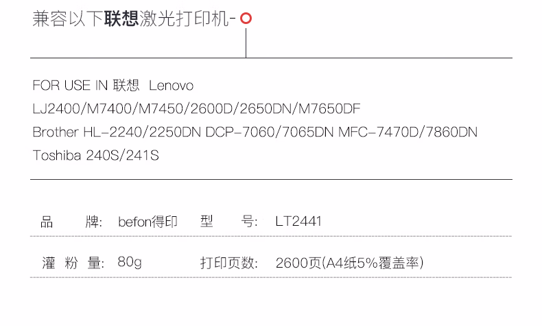 得印(befon) PLUS BF-LT2441 2600页适用联想LJ2400 墨粉盒 1.00 只/支 (计价单位:支) 黑色
